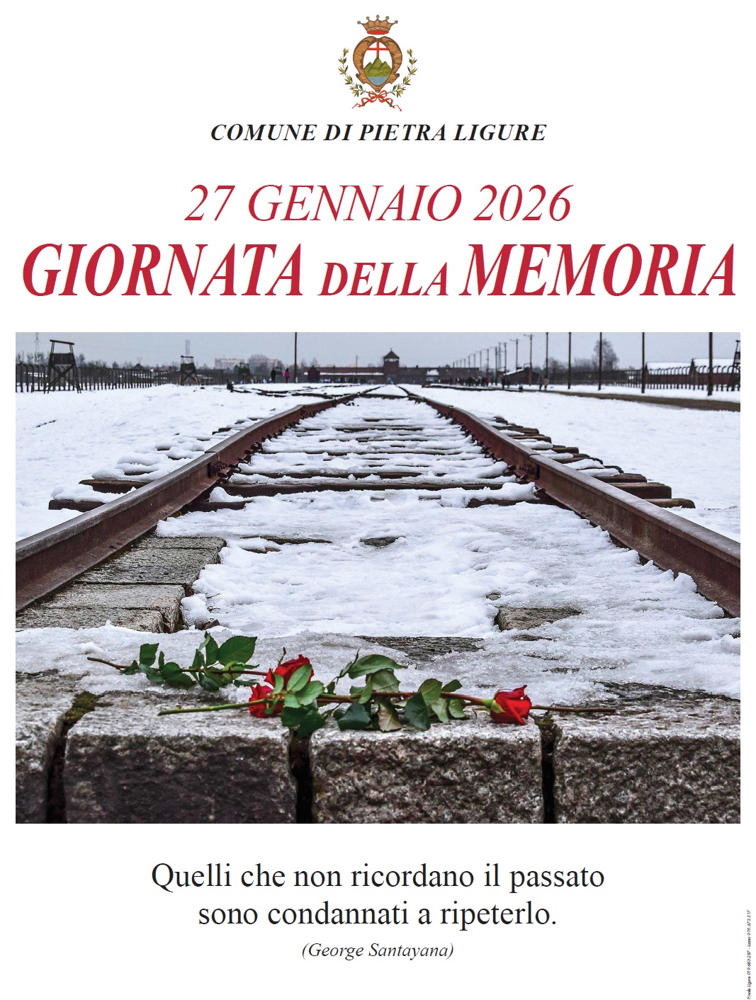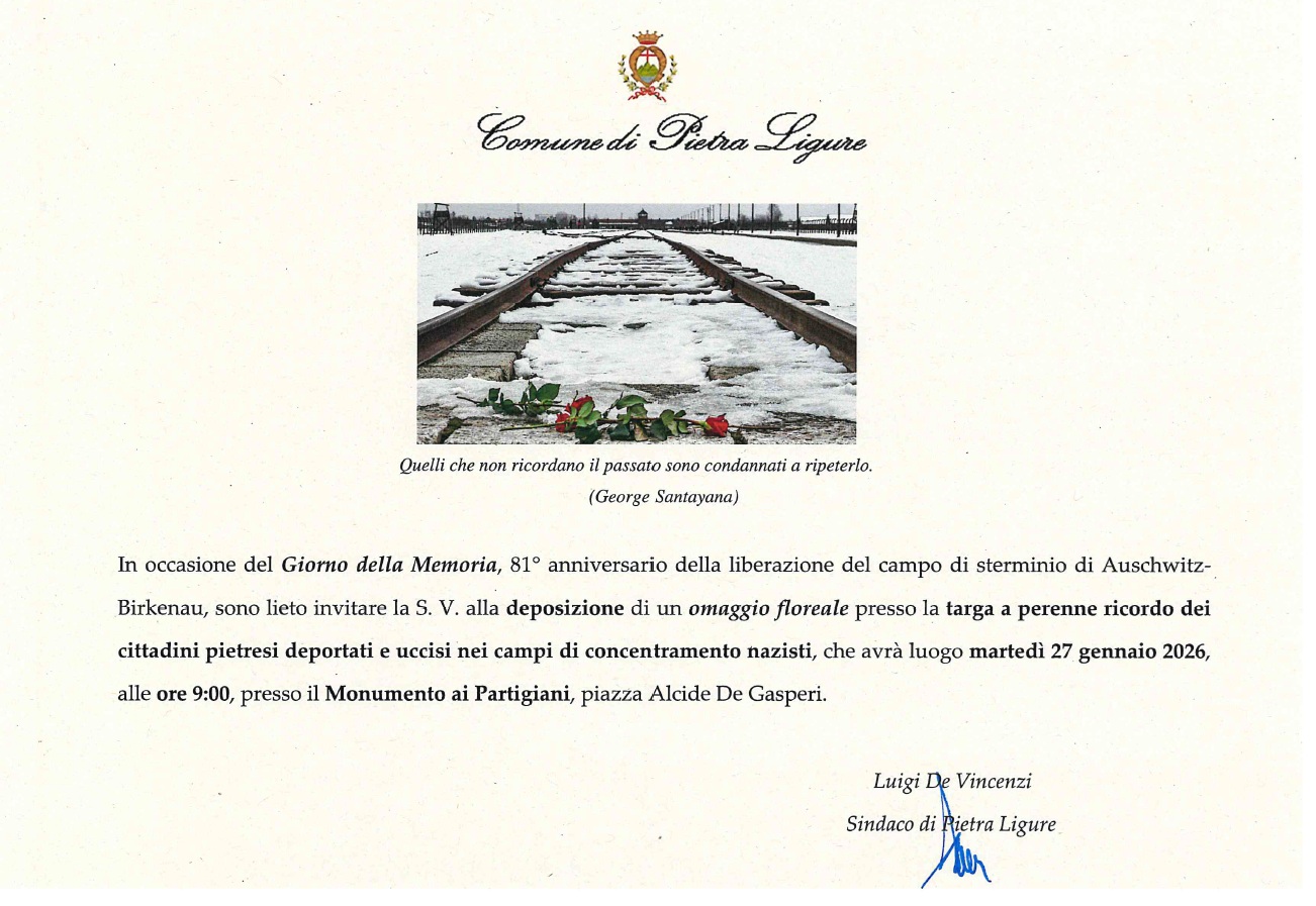 “Pietra Ligure celebra il Giorno della Memoria con due iniziative, a cui invitiamo a partecipare tutta la cittadinanza, volte a unire il doveroso omaggio istituzionale alla fondamentale sensibilizzazione delle giovani generazioni, rinnovando insieme il ricordo dalla Shoah e commemorando, attraverso i cittadini pietresi deportati e uccisi nei campi di concentramento nazisti, tutte le vittime dell’Olocausto. Una giornata importante e dall’alto contenuto civile per riflettere e conservare la memoria storica di un periodo oscuro e tragico della storia del nostro Paese e dell’Europa. Una giornata per non dimenticare mai e per ricordare sempre”, dichiara il Sindaco di Pietra Ligure Luigi De Vincenzi a nome dell’Amministrazione comunale.
