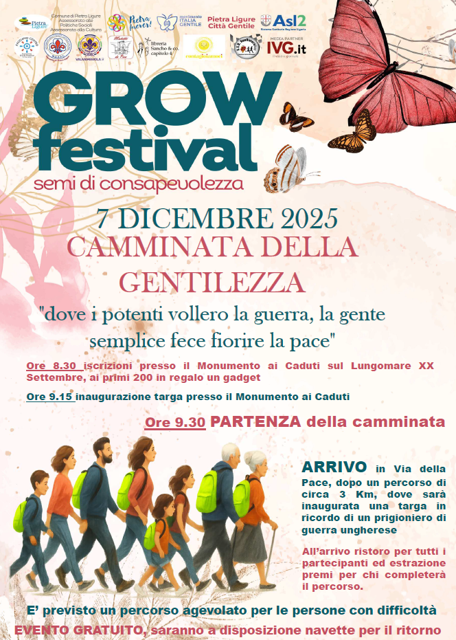 Dopo il grande successo dello scorso anno, domenica 7 dicembre si terrà la seconda edizione della Camminata della Gentilezza, uno degli eventi più importanti del Grow Festival, semi di consapevolezza.