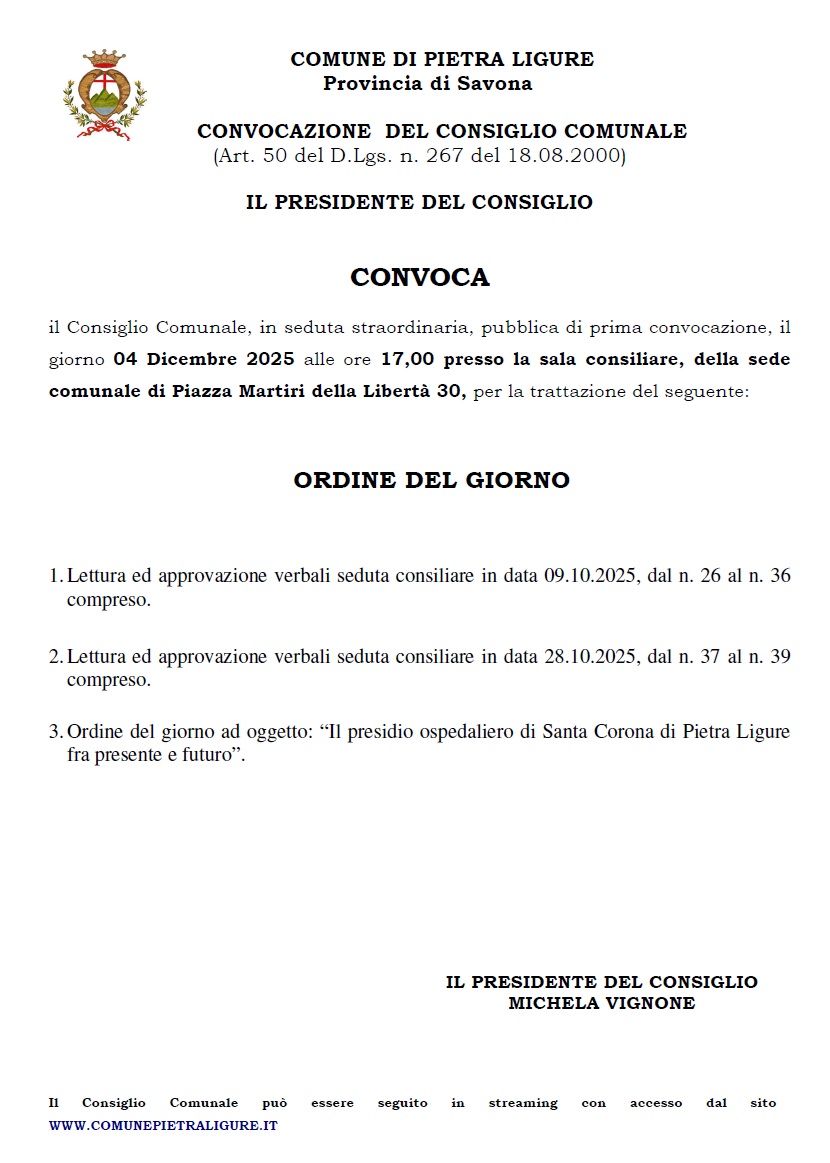 Il Consiglio Comunale è convocato, in seduta straordinaria e pubblica di prima convocazione, giovedì 4 dicembre 2025 alle ore 17:00 presso la sala consiliare “Augusto Rembado”, della sede comunale di Piazza Martiri della Libertà 30, per la trattazione del seguente ordine del giorno:
