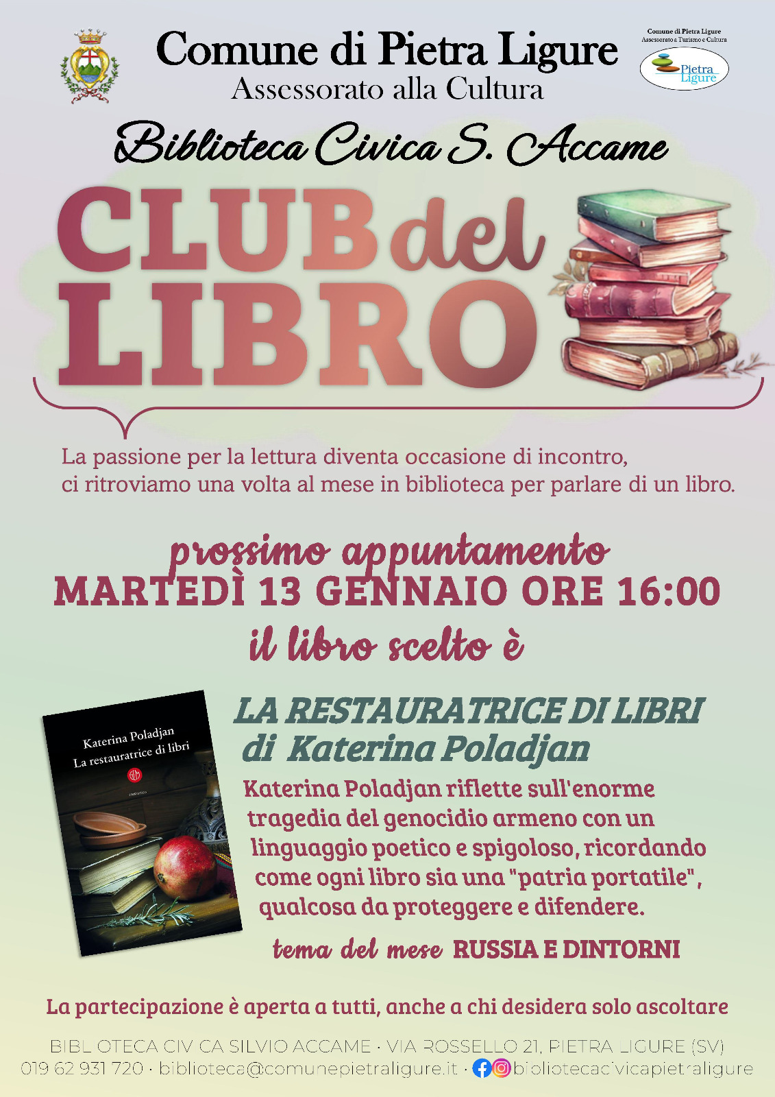 Martedì 13 gennaio alle ore 16.00 ci vediamo in Biblioteca per il primo incontro dell’anno del nostro Club del Libro.