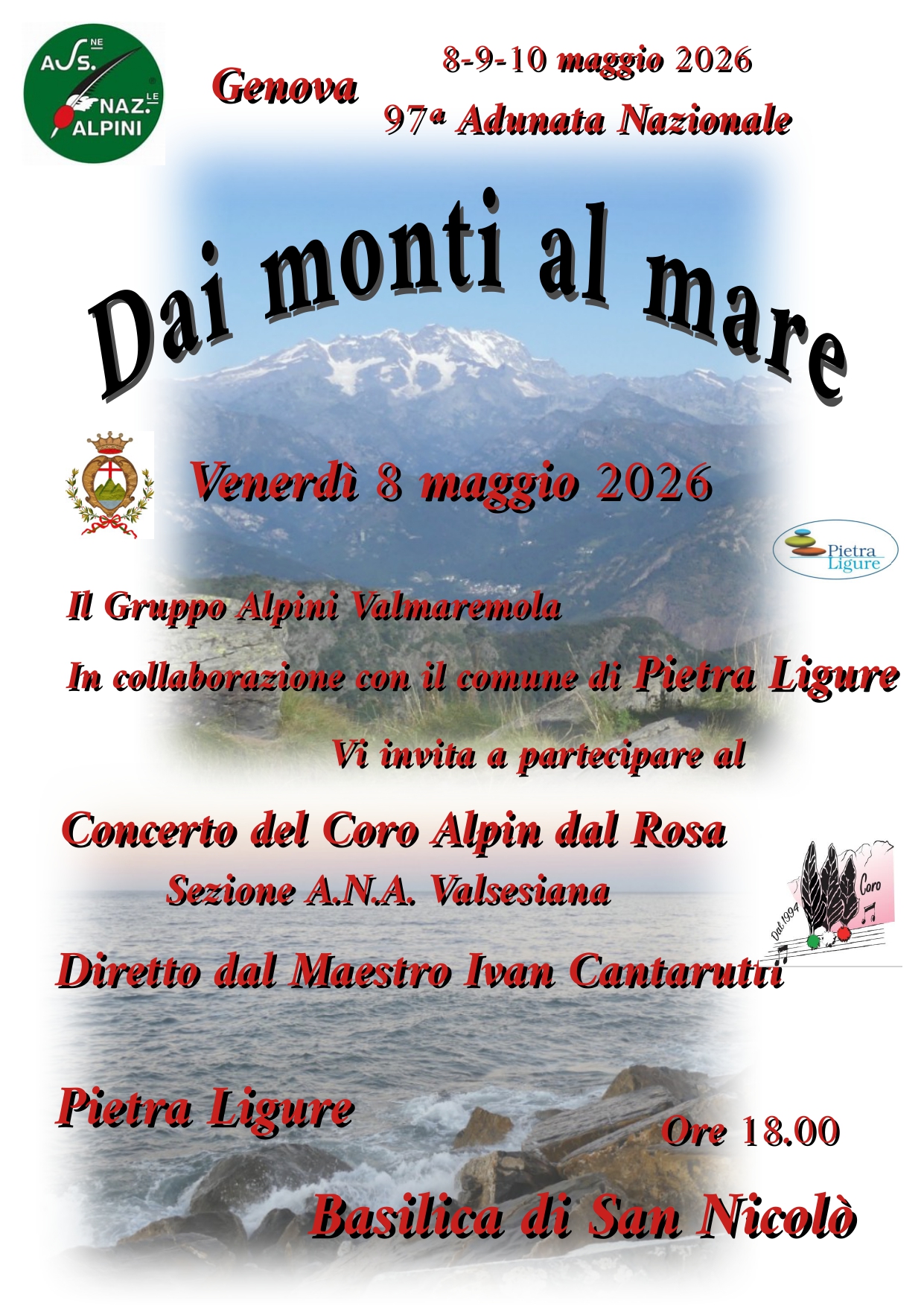 Venerdì 8 maggio 2026 alle ore 18.00 presso la Basilica di San Nicolò, il Gruppo Alpini Valmaremola invita la cittadinanza al Concerto del Coro Alpin dal Rosa, sezione A.N.A. Valsesiana, diretto dal Maestro Ivan Cantarutti.