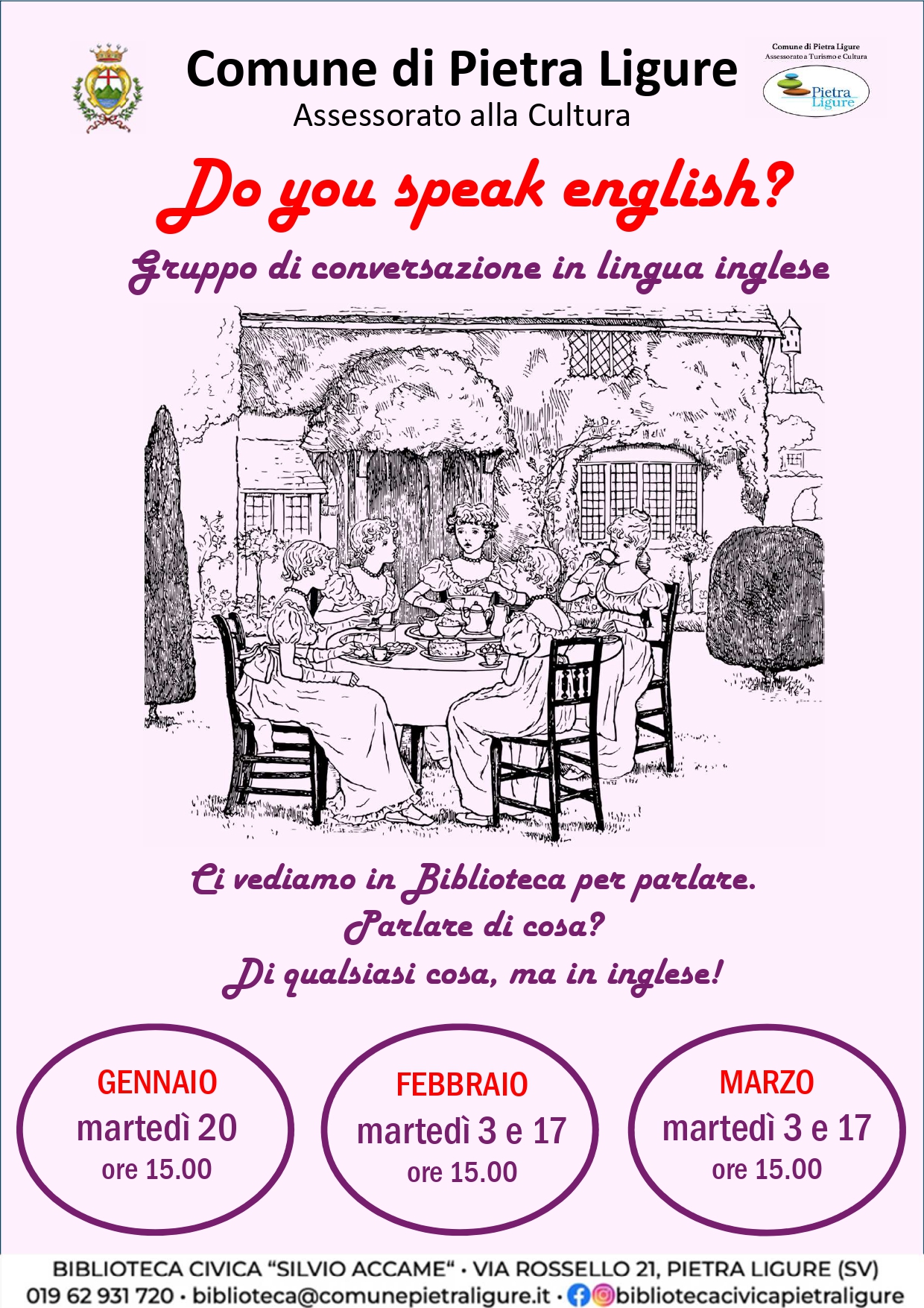 Chi vuole spolverare il suo inglese, scolastico o madrelingua, può unirsi al gruppo di conversazione inglese presso la Biblioteca civica.