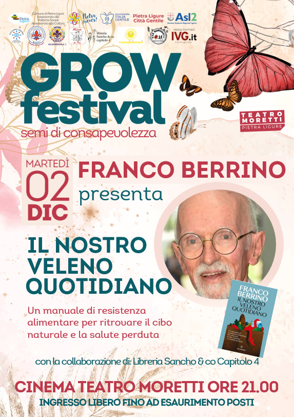 Martedì 2 dicembre alle ore 21.00 presso il Cinema Teatro Moretti, all’interno del Grow Festival, salirà sul palco Franco Berrino per parlarci del suo libro: Il nostro veleno quotidiano.