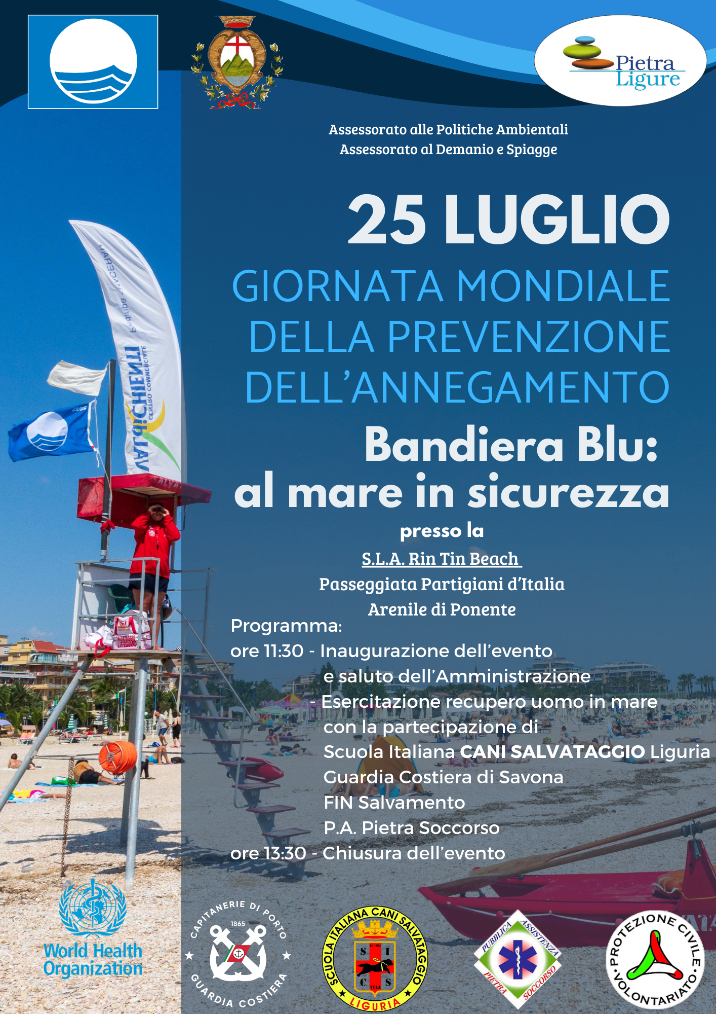 In occasione della Giornata mondiale della prevenzione dell’annegamento (World Drowing Prevention Day) che si celebra in tutto il mondo il 25 luglio di ogni anno, il Comune di Pietra Ligure, su proposta degli Assessorati alle politiche ambientali e al demanio e spiagge, aderisce all’invito rivolto da FEE Italia a tutte le località Bandiera Blu di dedicare questa giornata alla sensibilizzazione e all’informazione sulla necessità di prevenire gli annegamenti e, in collaborazione con la Capitaneria di Porto – Guardia Costiera, la sezione Liguria della Scuola Italiana Cani da Salvataggio (S.I.C.S.), la Protezione Civile e la P.A. Pietra Soccorso, promuove l’evento “Bandiera Blu: al mare in sicurezza”.