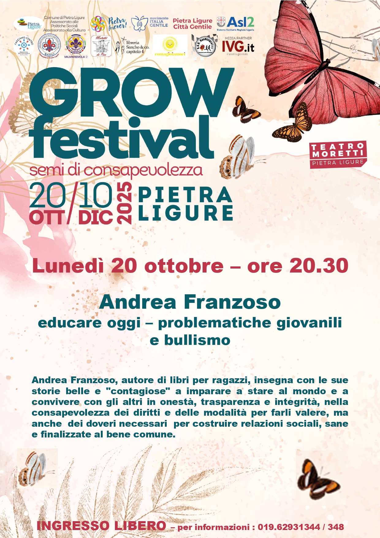 Andrea Franzoso lunedì 20 ottobre alle ore 20.30 presso il Teatro Moretti terrà un incontro-conferenza sulle problematiche giovanili e il bullismo.
