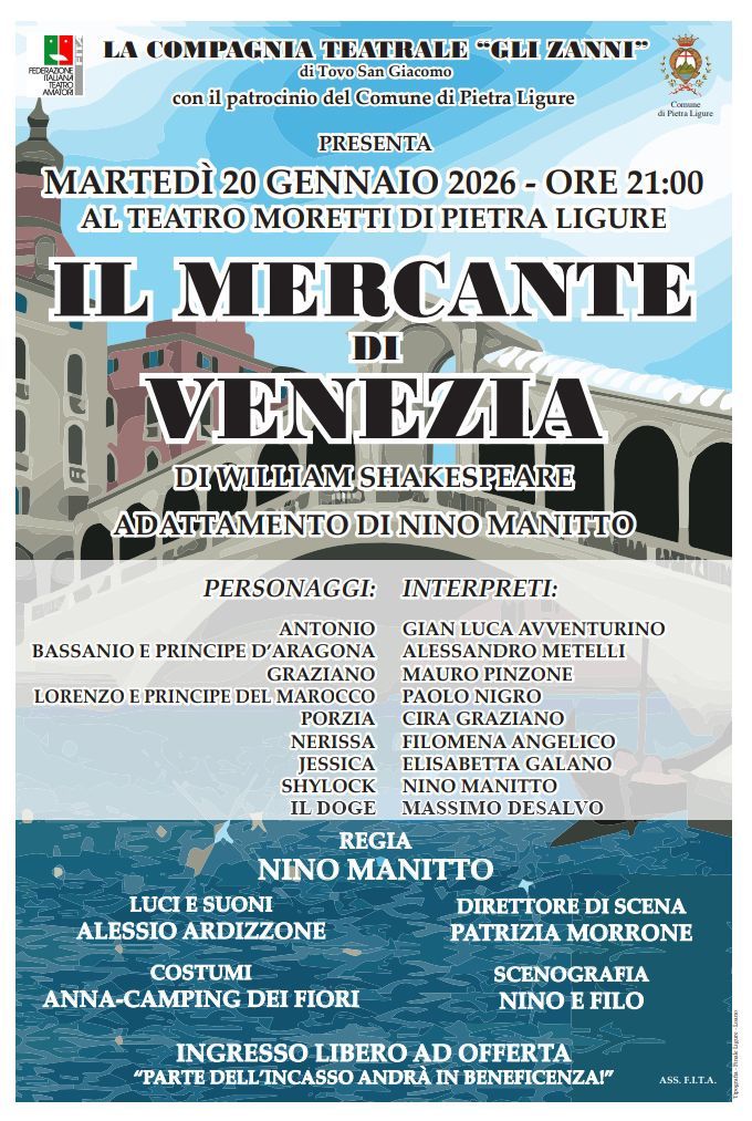 Martedì 20 gennaio 2026 la Compagnia Teatrale Gli Zanni porterà sul palcoscenico del Teatro Moretti lo spettacolo “Il Mercante di Venezia”.
