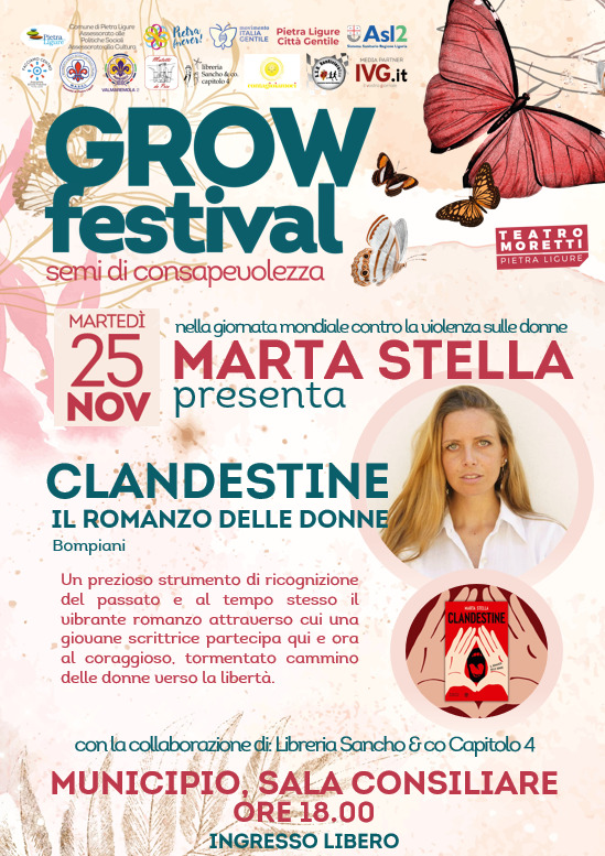 Il 25 novembre, nella Giornata Internazionale contro la Violenza sulle Donne, alle ore 18.00 presso la Sala Consiliare (piano terzo con ascensore del Palazzo Municipale), Marta Stella presenterà la sua opera Clandestine, il romanzo delle donne.